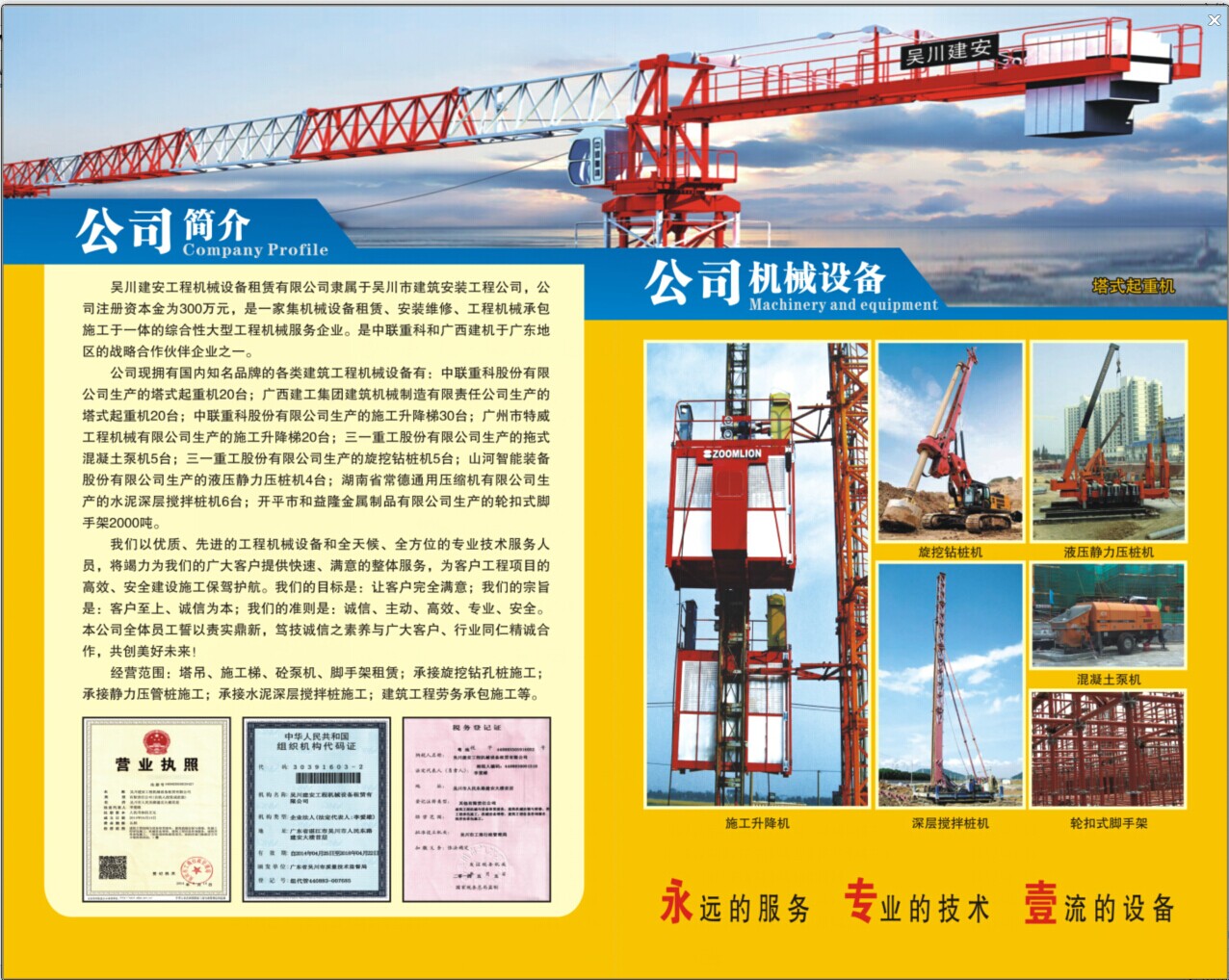 公司經營范圍:塔吊、施工電梯、砼泵機、腳手架租賃;承接旋挖鉆孔樁施工;承接靜力壓管樁施工 ;承接水泥深層攪拌樁施工;承接建筑工程勞務承包施工等。