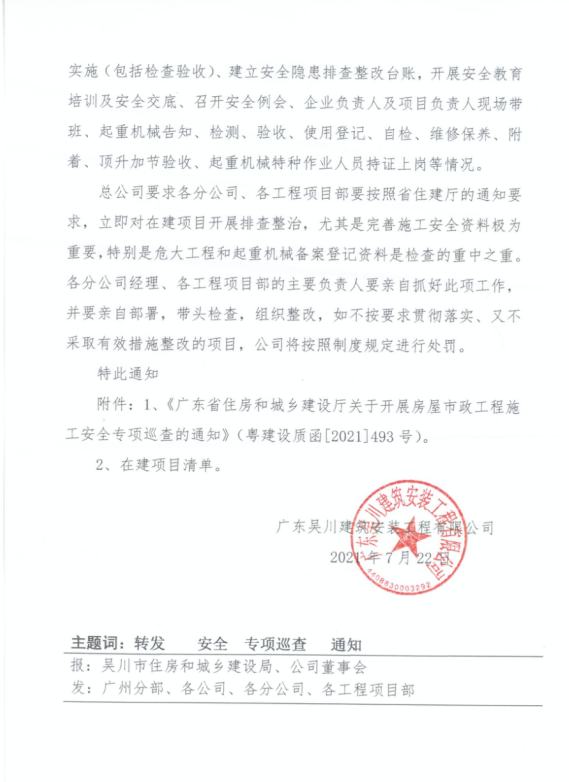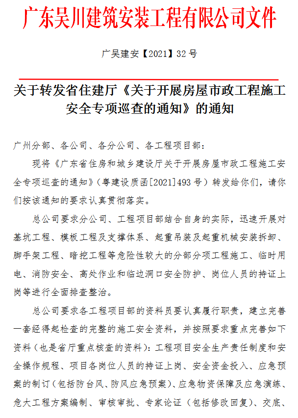 關于轉發省住建廳《關于開展房屋市政工程施工安全專項巡查的通知》的通知