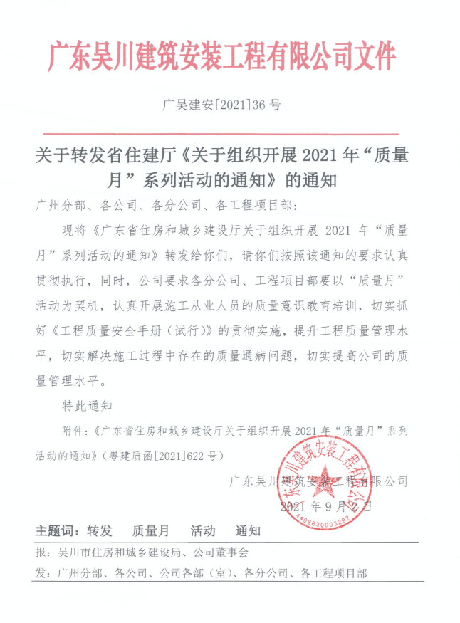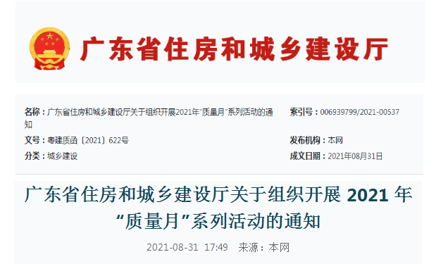 關于轉發廣東省住建廳《關于組織開展2021年“質量月”活動的通知》的通知